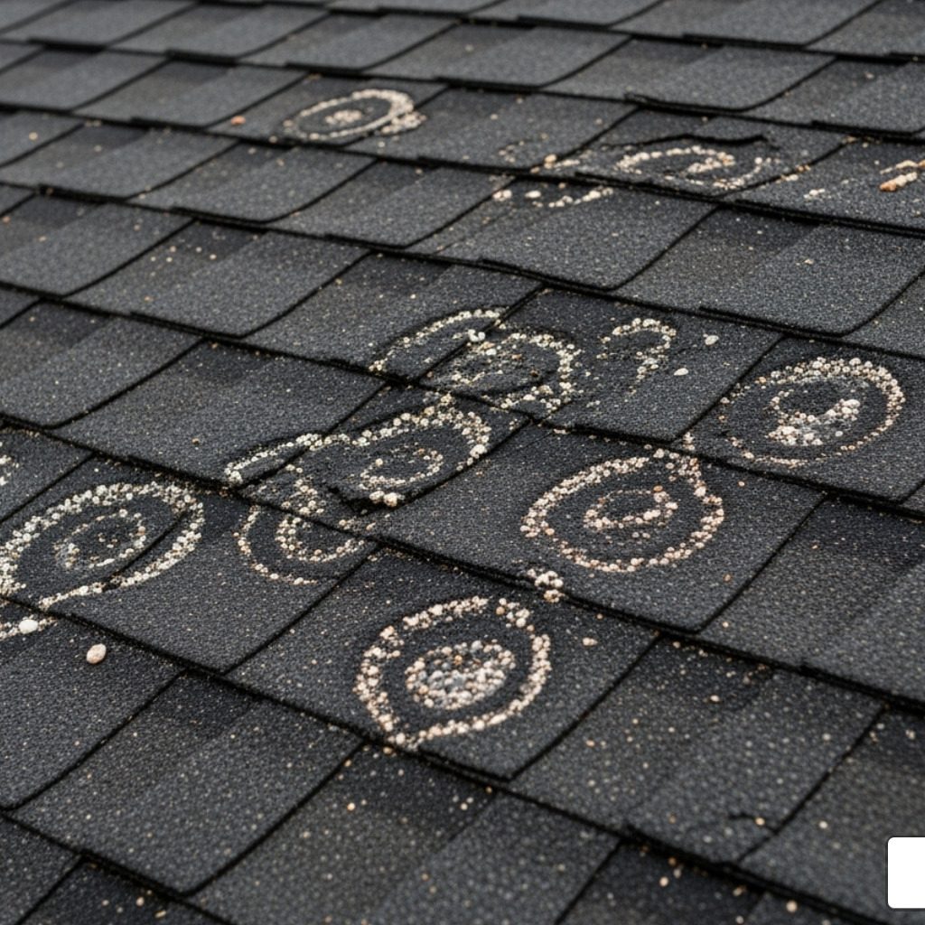 | Granule Loss | Granules “pop off” cleanly; shingle mat often visible at crater bottom | Granules dislodged, crushed, or pressed into asphalt; significant accumulation in gutters |